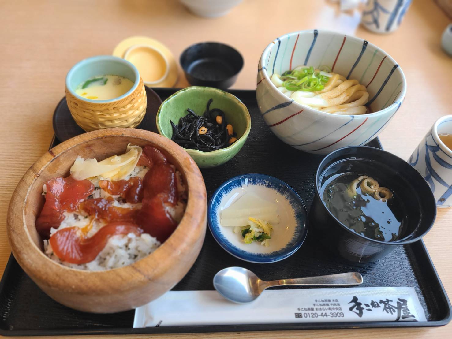 柔らかいおうどんとてごね寿司! おうどんの味付けは甘めの醤油で衝撃を受けました!てごね寿司のネタはカツオで甘めの醤油で浸けてありました。両品とも「まいうー」でした。
